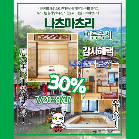 나츠마츠리 기간동안 료칸 숙박 할인 예약이 가능하니 아래 페이지에서 예매하시기 바랍니다.